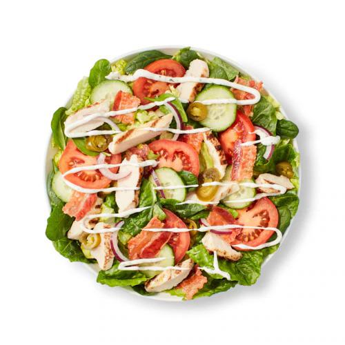 Create your own Chicken & Bacon salad. With all the fresh veggies and sauces you like.
